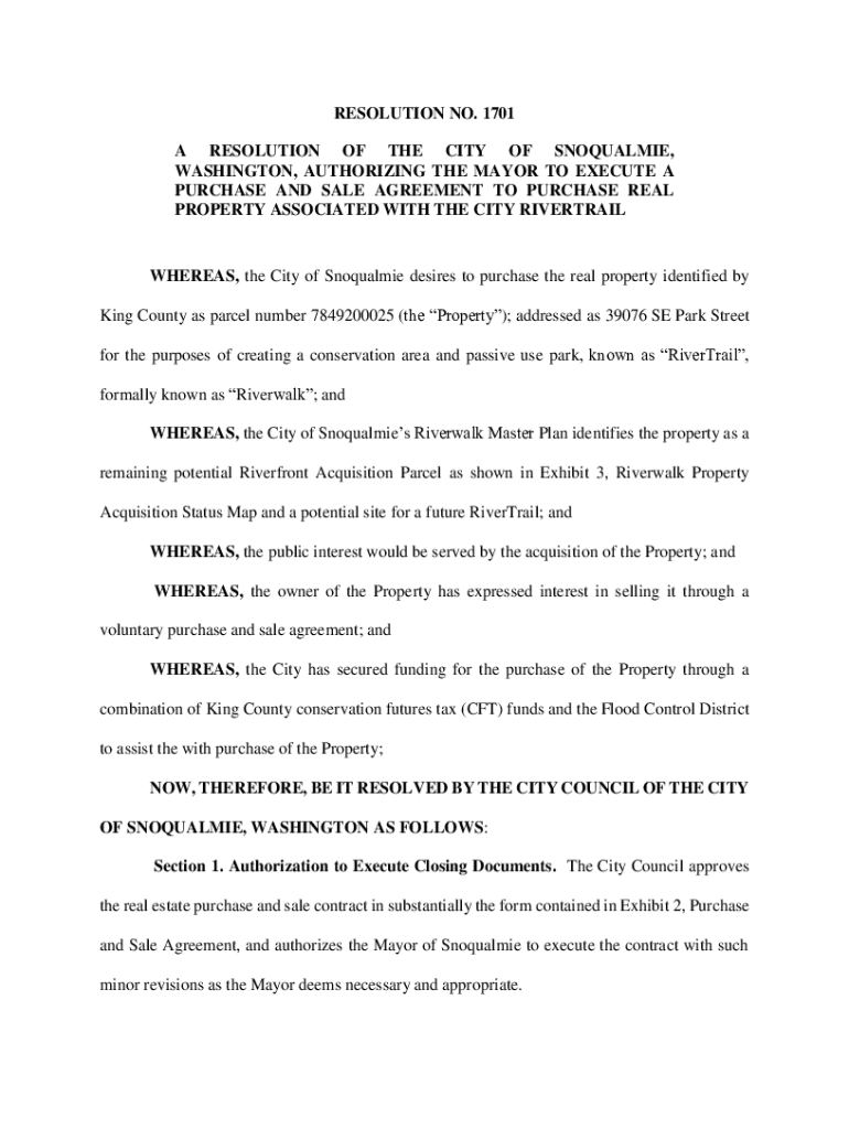 RESOLUTION NO. 1701 A RESOLUTION OF THE CITY OF SNOQUALMIE, WASHINGTON, AUTHORIZING THE MAYOR TO EXECUTE A PURCHASE AND SALE AGREEMENT TO PURCHASE REAL PROPERTY ASSOCIATED WITH THE CITY RIVERTRAILWHEREAS,