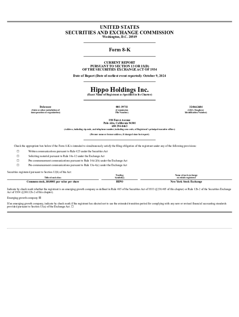 This document is a current report filed by Hippo Holdings Inc. with the SEC, detailing the departure of Yuval Harry as Chief Revenue Officer, the terms of his separation agreement, and relevant financial implications for the company.