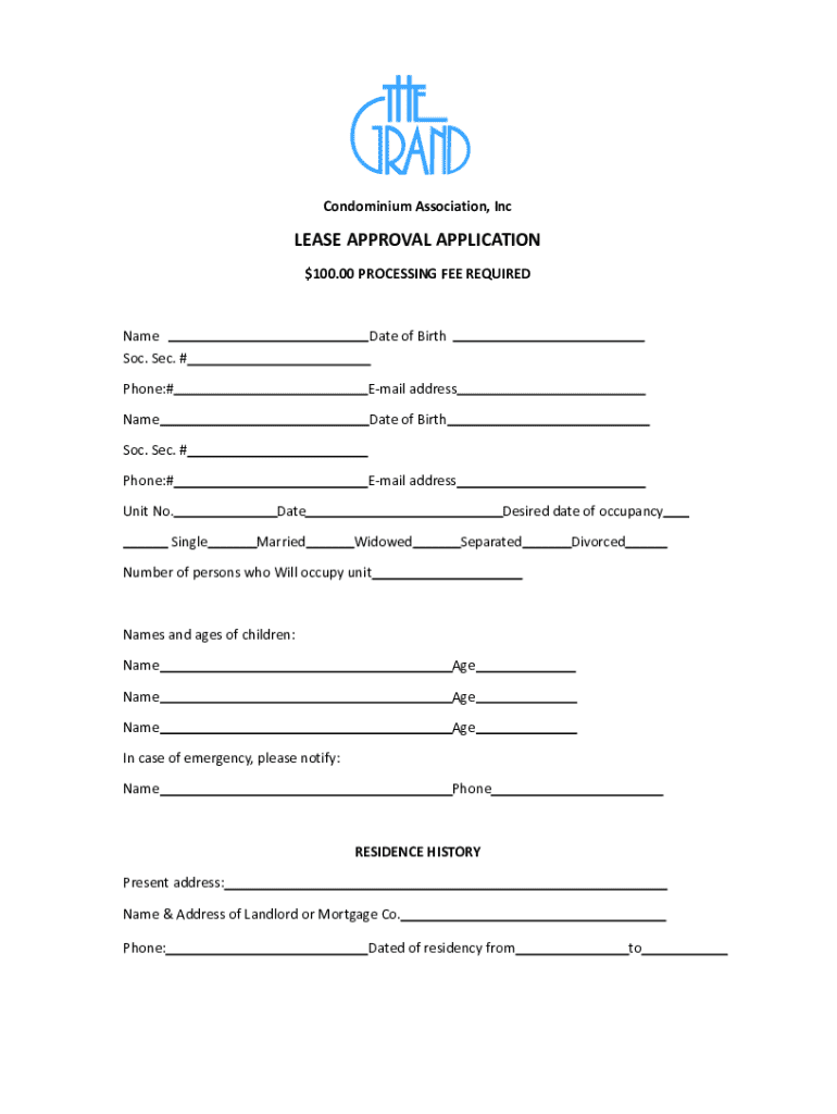 This document is a lease approval application for the Grand Condominium Association, requiring the applicant to provide personal information, residence history, employment references, character references, and vehicle information, along with an authorization for background checks. It outlines the association\'s policies and approval processes.