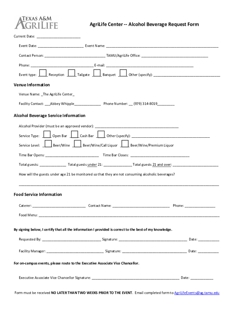 This form is used to request approval for serving alcoholic beverages at events hosted at the AgriLife Center. It collects essential details about the event, including the event name, date, contact information, and venue details, along with the specific alcohol service requested.