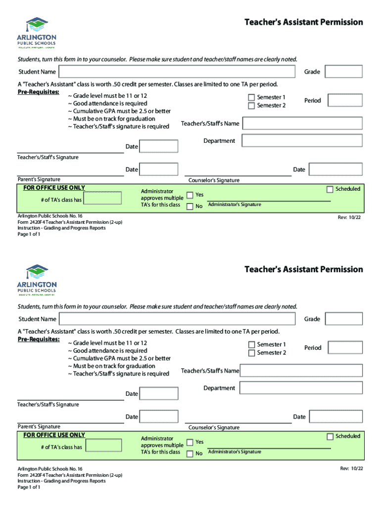 Este formulario es para que los estudiantes pidan permiso para ser asistentes de profesores. Se requiere la firma del profesor y del padre, y el estudiante debe cumplir con ciertos requisitos de grado y GPA.