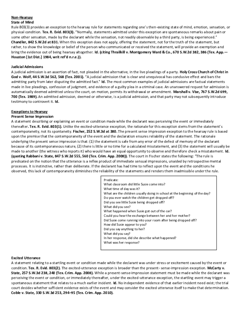NonHearsay State of Mind Rule 803(3) provides an exception to the hearsay rule for statements regarding ones thenexisting state of mind, emotion, sensation, or physical condition. Tex. R. Evid. 803(3).