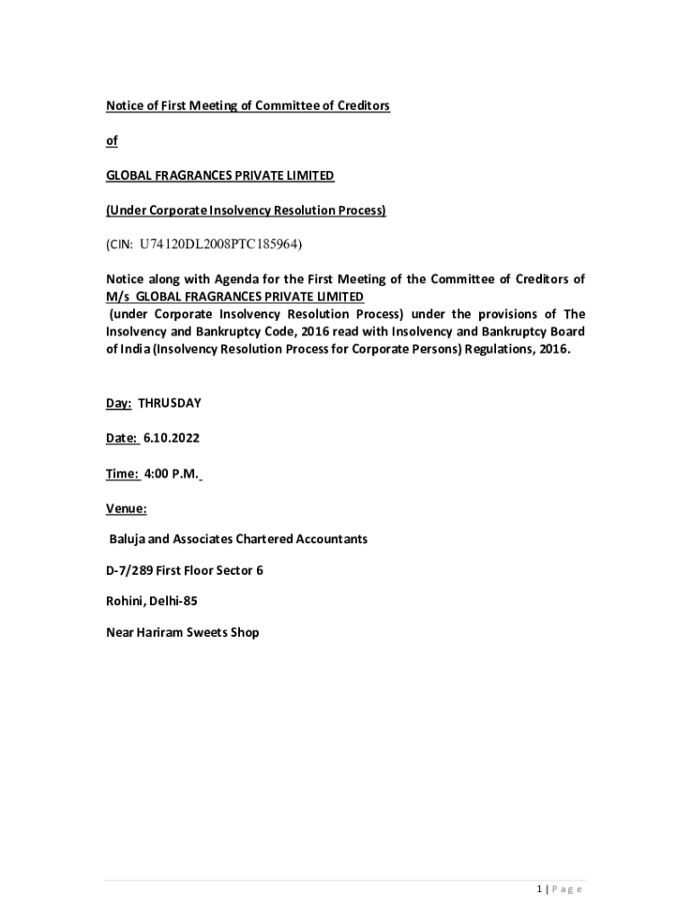 Get the free notice agenda coc Global frageance P Ltd - ibbi gov