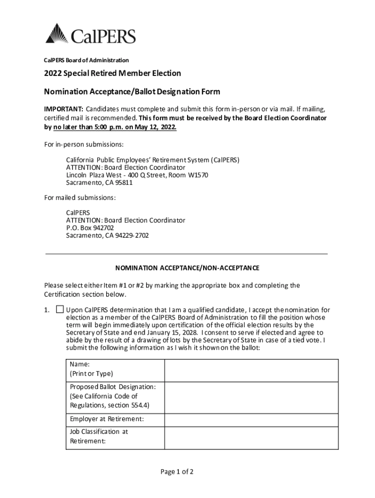 Este formulario es para la aceptación de nominaciones y la designación de boletas para la elección especial de miembros jubilados del CalPERS. Los candidatos deben completar y enviar este formulario en persona o por correo antes de la fecha límite.