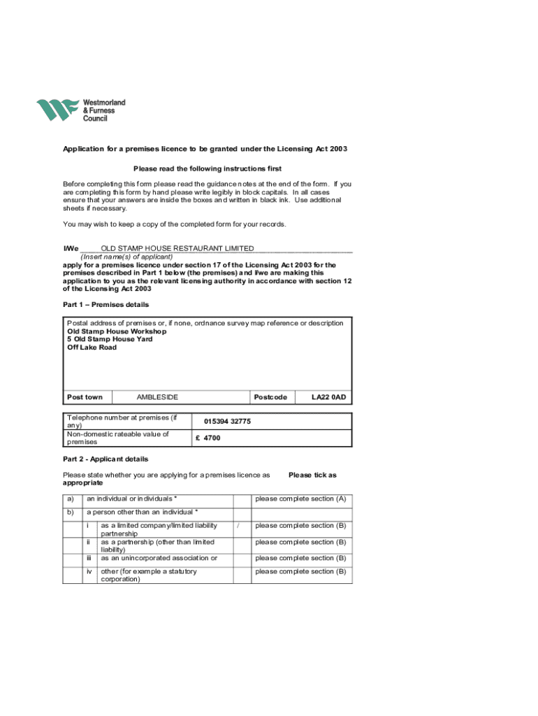This form is to apply for a premises licence as per the Licensing Act 2003. It includes instructions for completion, applicant details, premises information, and the intended licensable activities. Further guidance and requirements for the application process are also included.