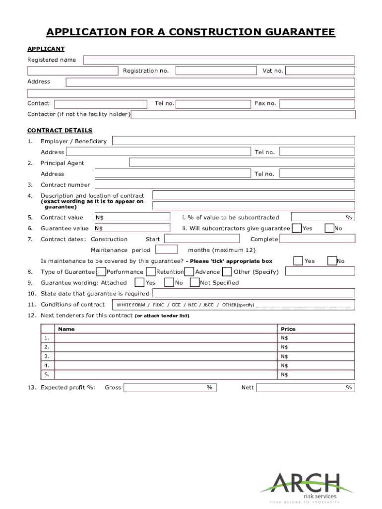 This document serves as an application for obtaining a construction guarantee, detailing information about the applicant, contract information, and terms of the guarantee.