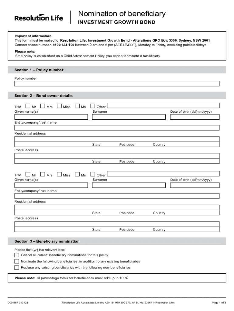 This form is used for nominating beneficiaries for the Investment Growth Bond. It includes sections for personal details of the bond owner and the nominated beneficiaries, along with rules and declaration.