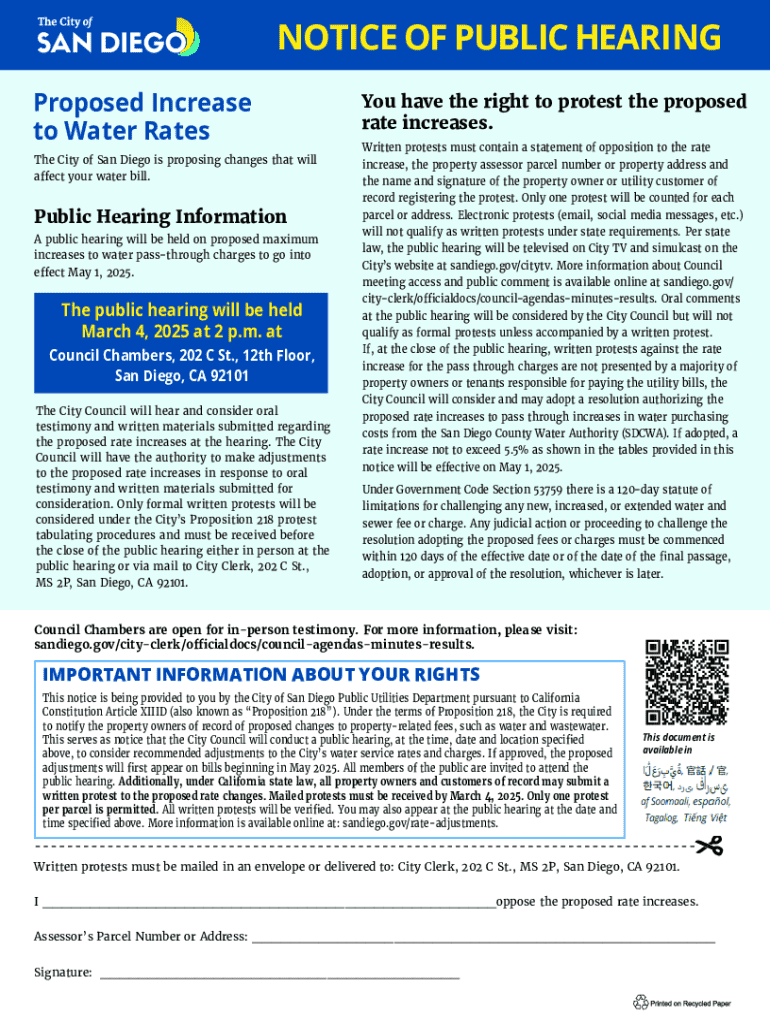 NOTICE OF PUBLIC HEARING Proposed Increase to Water Rates The City of San Diego is proposing changes that will affect your water bill.Public Hearing Information A public hearing will be held on proposed