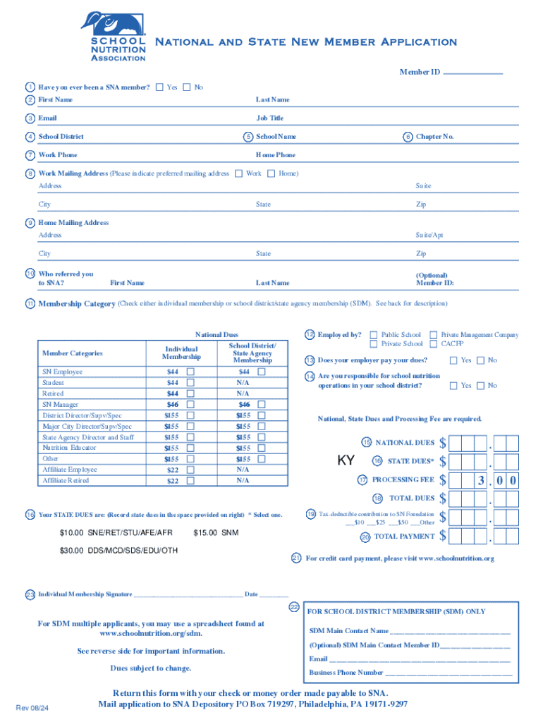 This document serves as an application for new members to join the School Nutrition Association (SNA), covering both individual and school district memberships. It includes sections for personal information, membership category selection, dues payment, and instructions for submission.