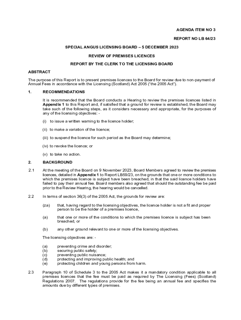Este informe presenta las licencias de locales para su revisión debido al incumplimiento del pago de las tarifas anuales de acuerdo con la Ley de Licencias de Escocia de 2005. Se recomiendan acciones para revisar y tomar decisiones sobre las licencias.