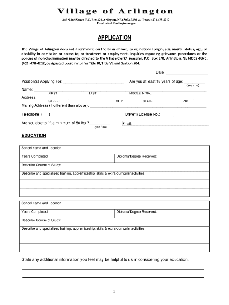 This is an employment application form for the Village of Arlington. It collects personal information, educational background, employment history, special skills, and references from applicants. The form emphasizes non-discrimination and requires consent for prior employers to provide information.