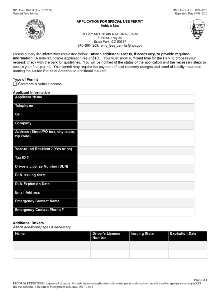 Este formulario es una solicitud para obtener un permiso especial para el uso de vehículos en el Parque Nacional Rocky Mountain. Incluye información sobre el solicitante, detalles del vehículo y requisitos necesarios para la aprobación del permiso.