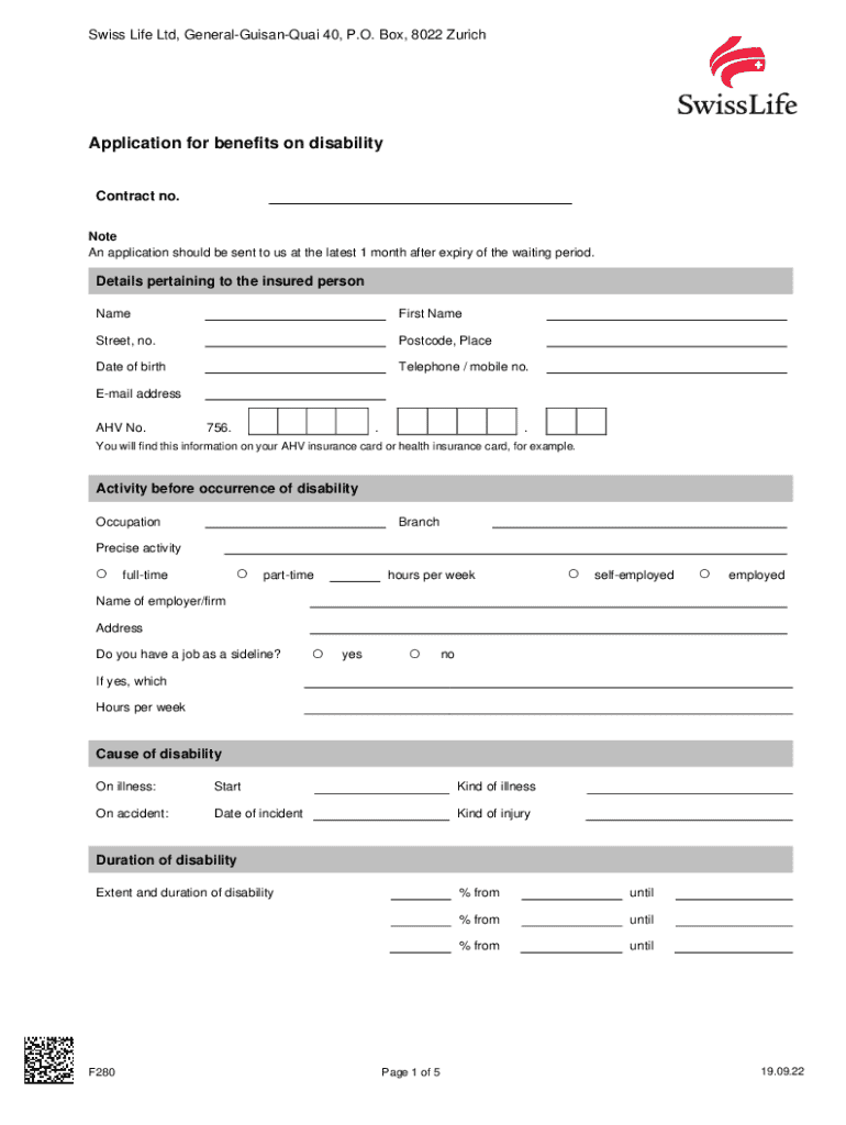 ResetPrint Swiss Life Ltd, GeneralGuisanQuai 40, P.O. Box, 8022 ZurichApplication for benefits on disability Contract no. Note An application should be sent to us at the latest 1 month after expiry
