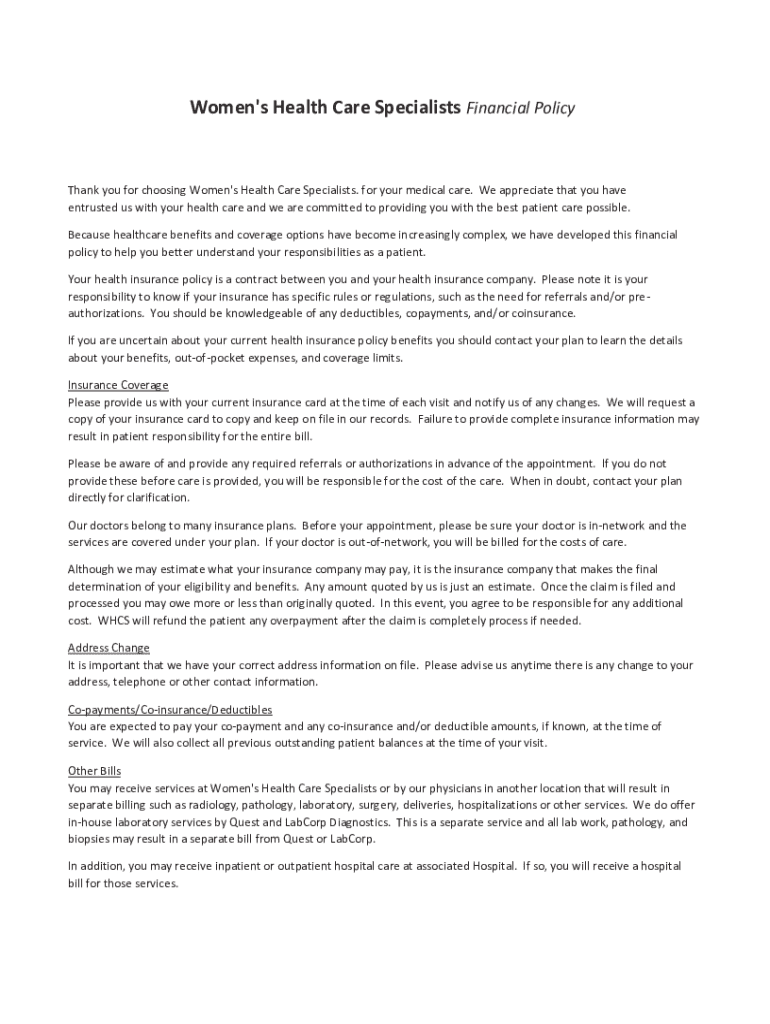 t,^Financial PolicyThank you for choosing t,^. for your medical care. We appreciate that you have entrusted us with your health care and we are committed to providing you with the best patient care