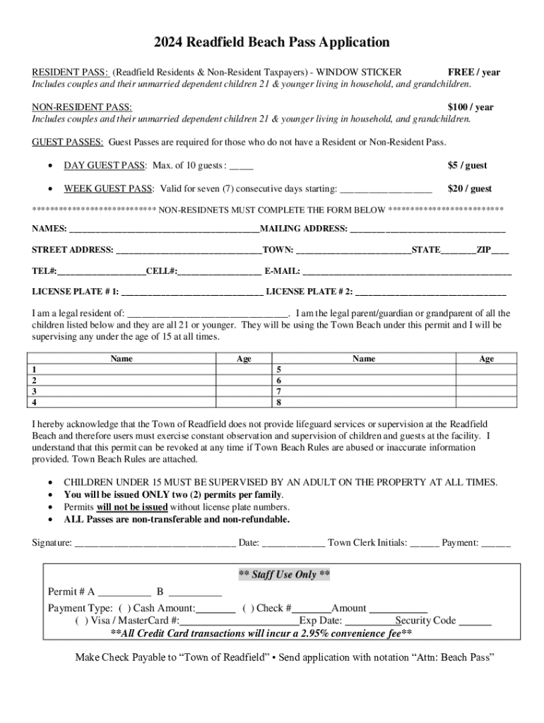 2024 Readfield Beach Pass Application RESIDENT PASS: (Readfield Residents & NonResident Taxpayers) WINDOW STICKER FREE / year Includes couples and their unmarried dependent children 21 & younger living