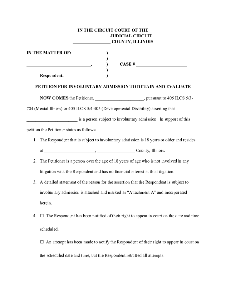 IN THE CIRCUIT COURT OF THE ___ JUDICIAL CIRCUIT ___ COUNTY, ILLINOIS IN THE MATTER OF: ___, Respondent.) ) ) ) )CASE # ___PETITION FOR INVOLUNTARY ADMISSION TO DETAIN AND EVALUATE NOW COMES the Petitioner,