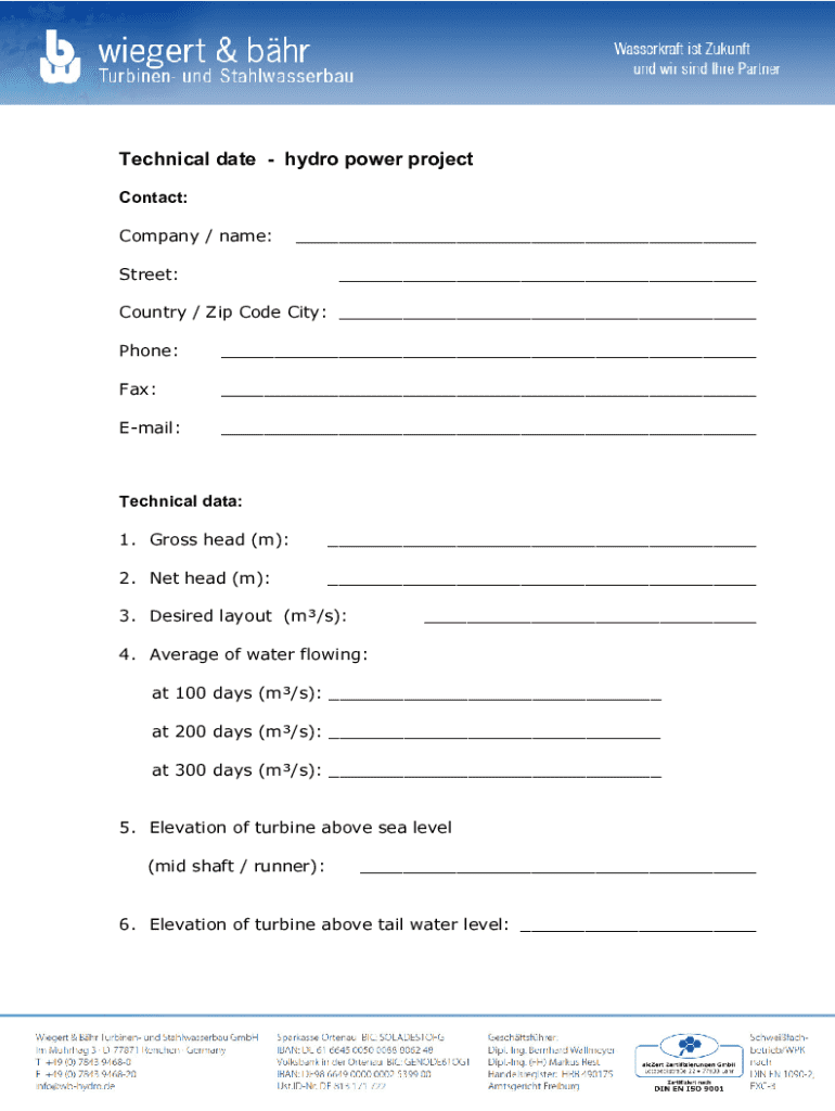Technical date hydro power project Contact: Company / name:___Street:___Country / Zip Code City: ___ Phone:___Fax:___Email:___Technical data: 1. Gross head (m):___2. Net head (m):___3. Desired layout