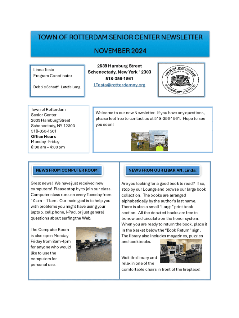 This newsletter provides information on various programs, events, and resources available at the Rotterdam Senior Center for seniors in the community, including computer classes, book borrowing, Medicare consultations, holiday events, and educational workshops.