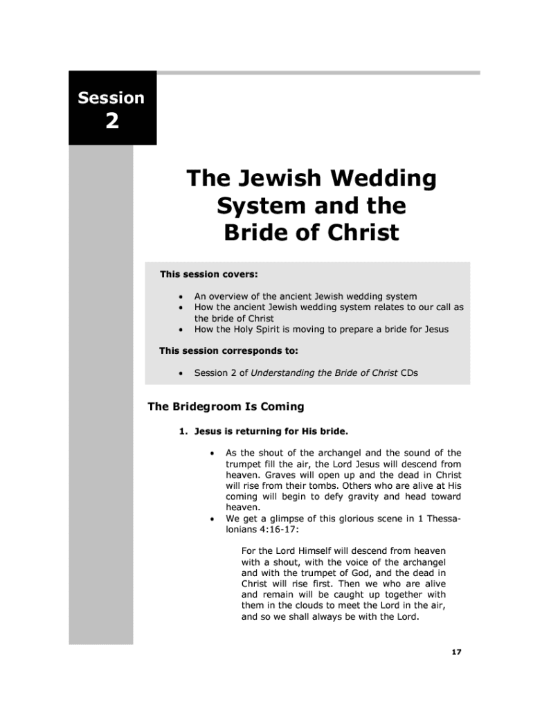 Session2The Jewish Wedding System and the Bride of Christ This session covers: An overview of the ancient Jewish wedding system How the ancient Jewish wedding system relates to our call as the bride