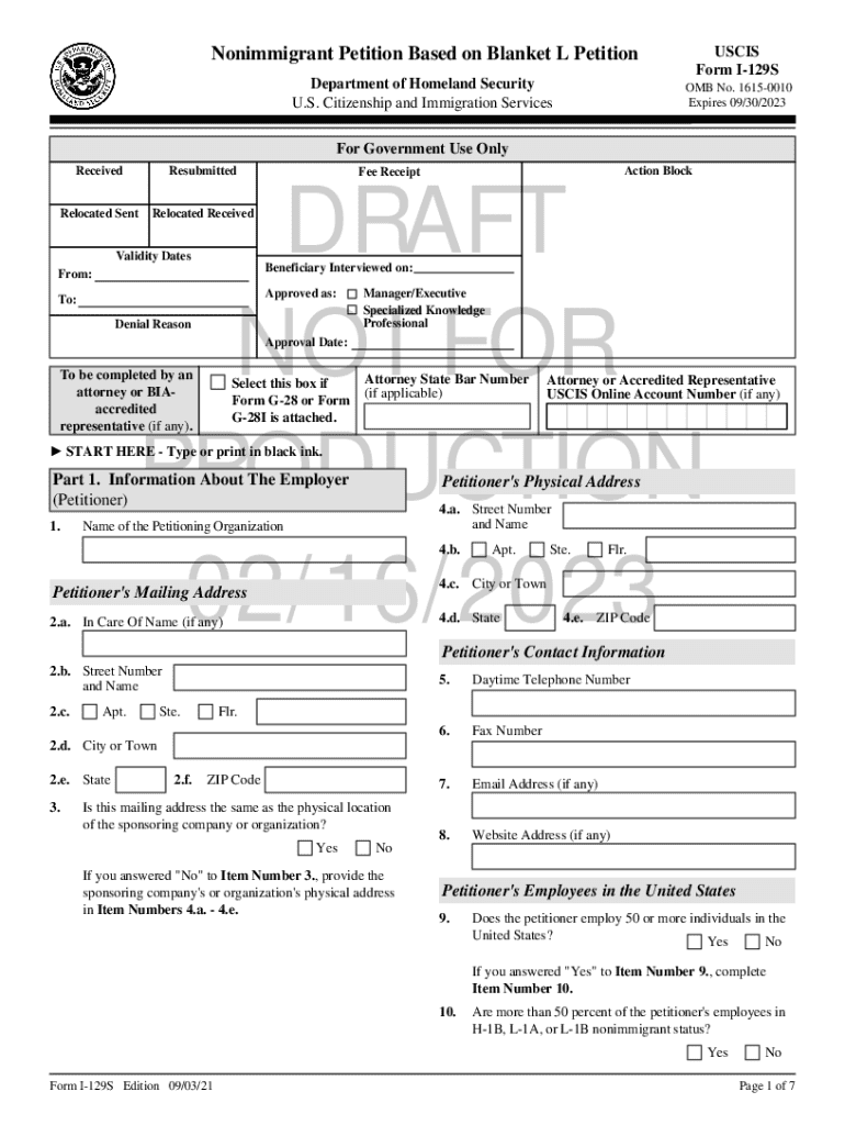 USCIS Form I129SNonimmigrant Petition Based on Blanket L Petition Department of Homeland Security U.S. Citizenship and Immigration ServicesOMB No. 16150010 Expires 09/30/2023For Government Use OnlyReceivedDRAFT