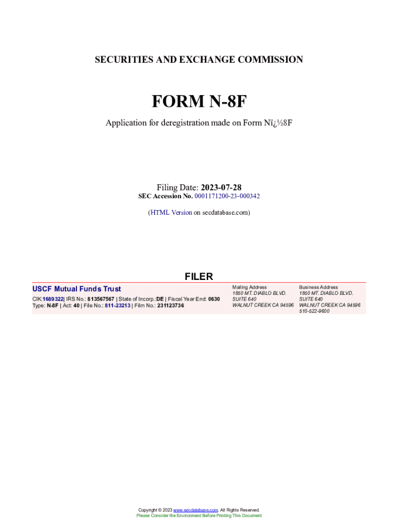 This is the application form for deregistration made by USCF Mutual Funds Trust, outlining the reasons for deregistration, related details about the fund, and requisite approvals from the board and shareholders. It includes sections on distributions to shareholders, assets and liabilities, and events leading to the request for deregistration.