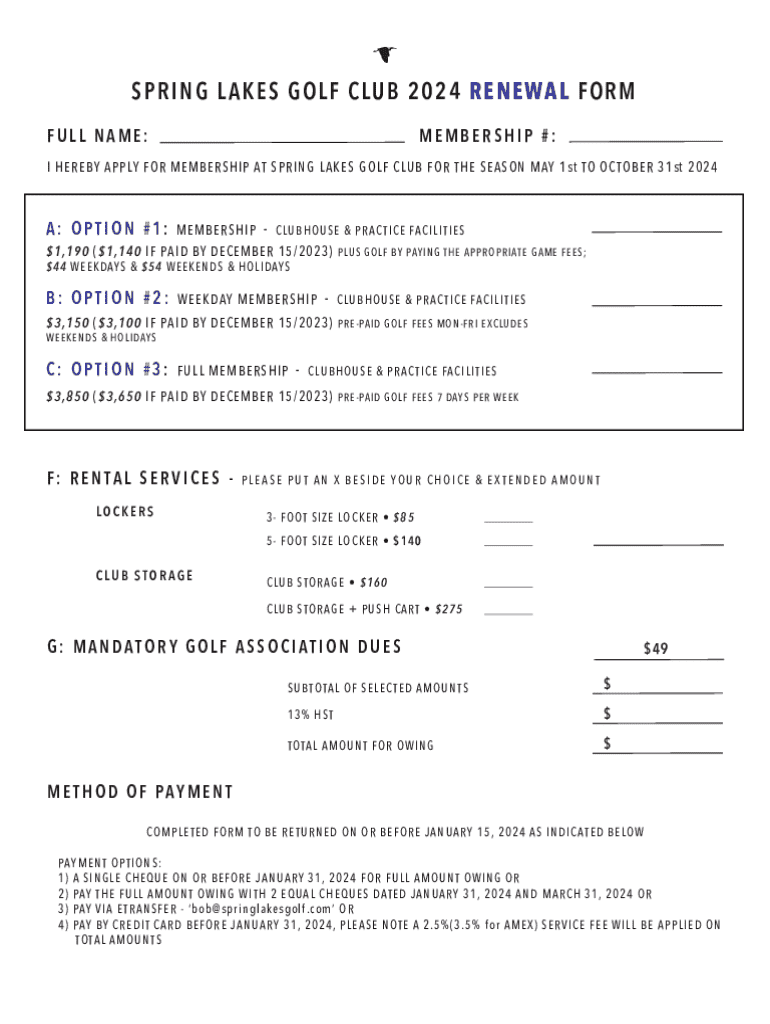This form is for members of Spring Lakes Golf Club to renew their membership for the 2024 season. It includes information on membership options, payment methods, and conditions of membership.