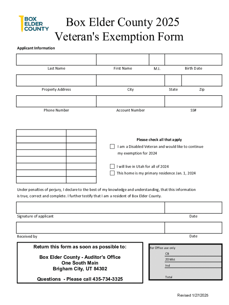 Get the free Box Elder County 2025 Veteran's Exemption Form