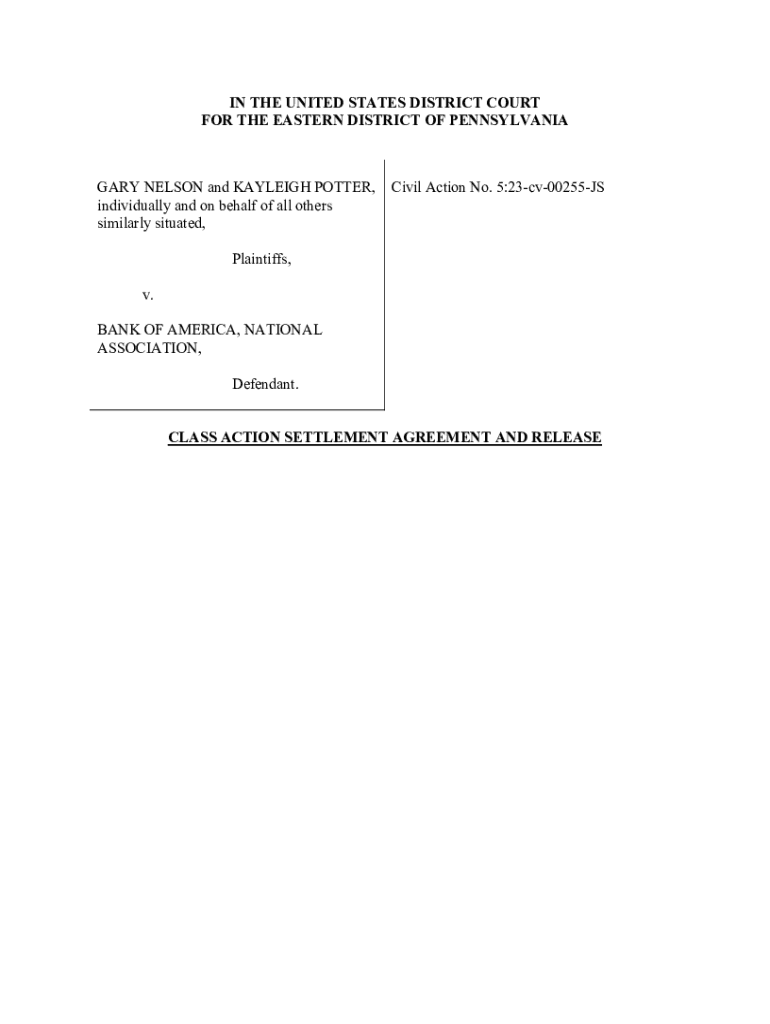 This document outlines the settlement agreement reached between Gary Nelson and Kayleigh Potter (Plaintiffs) and Bank of America, N.A. (Defendant) concerning alleged violations of the Pennsylvania UCC and MVSFA related to notices of repossession. It provides details on the settlement fund, the rights of class members, and the procedures for objections and opt-outs.