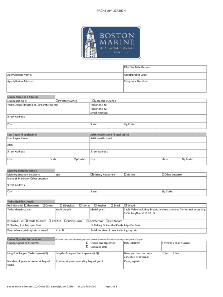 YACHT APPLICATIONEffective Date Desired: Agent/Broker Name:Agent/Broker Code:Agent/Broker Address:Telephone Number:Owner Name and Address Privately owned Ownership type: Yacht Owner (Insured or Corporate)