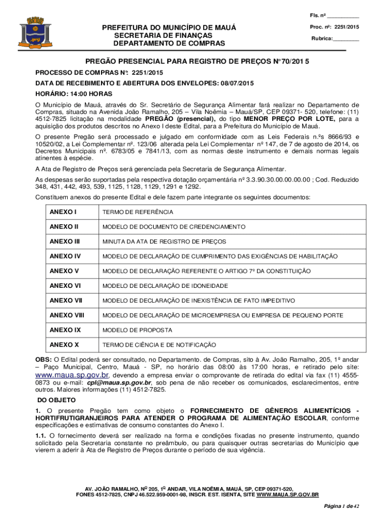 Fls. n ___PREFEITURA DO MUNICPIO DE MAU SECRETARIA DE FINANAS DEPARTAMENTO DE COMPRASProc. n: 2251/2015 Rubrica:___PREGO PRESENCIAL PARA REGISTRO DE PREOS N 70/201 5 PROCESSO DE COMPRAS N: 2251/2015