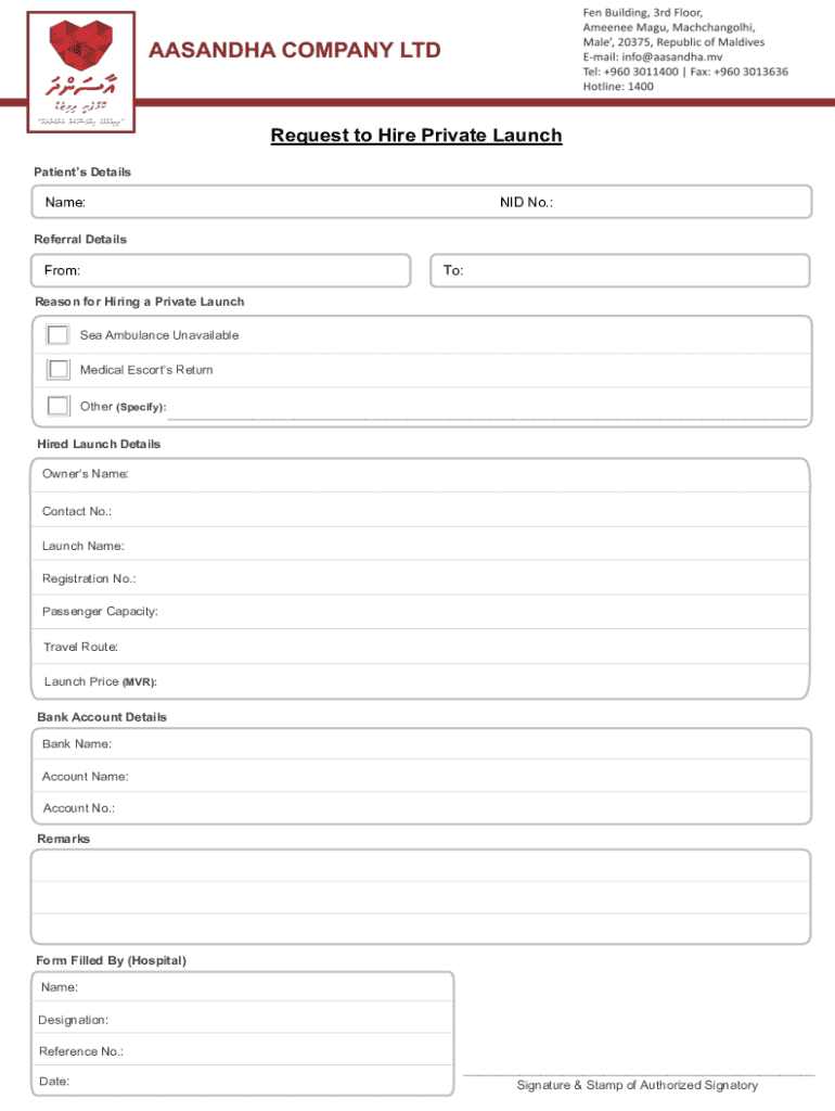 This form is designed for hospitals to request the hiring of a private launch for patient\'s transportation, particularly when sea ambulance services are unavailable. It includes sections for patient details, referral specifics, hired launch details, bank account information, and authorization.