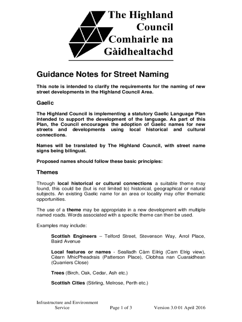 Guidance Notes for Street Naming This note is intended to clarify the requirements for the naming of new street developments in the Highland Council Area.Gaelic The Highland Council is implementing