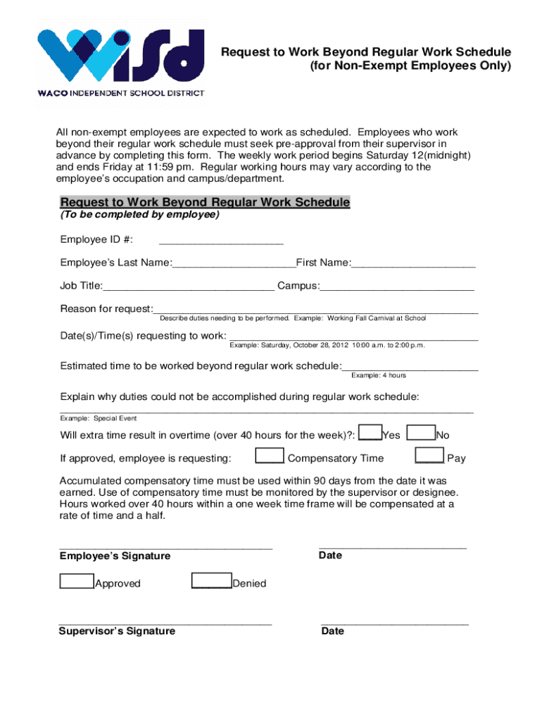 This form is to be completed by non-exempt employees seeking pre-approval from their supervisor to work beyond their regular work schedule. It includes sections for employee identification, reason for the request, duties to be performed, and whether the extra time worked will result in overtime.