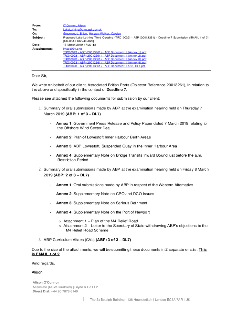 From: To: Cc: Subject: Date: Attachments:O\"Connor, Alison LakeLothing@pins.gsi.gov.uk Greenwood, Brian; MorganWelker, Carolyn Proposed Lake Lothing Third Crossing (TRO10023) ABP (20013261) Deadline