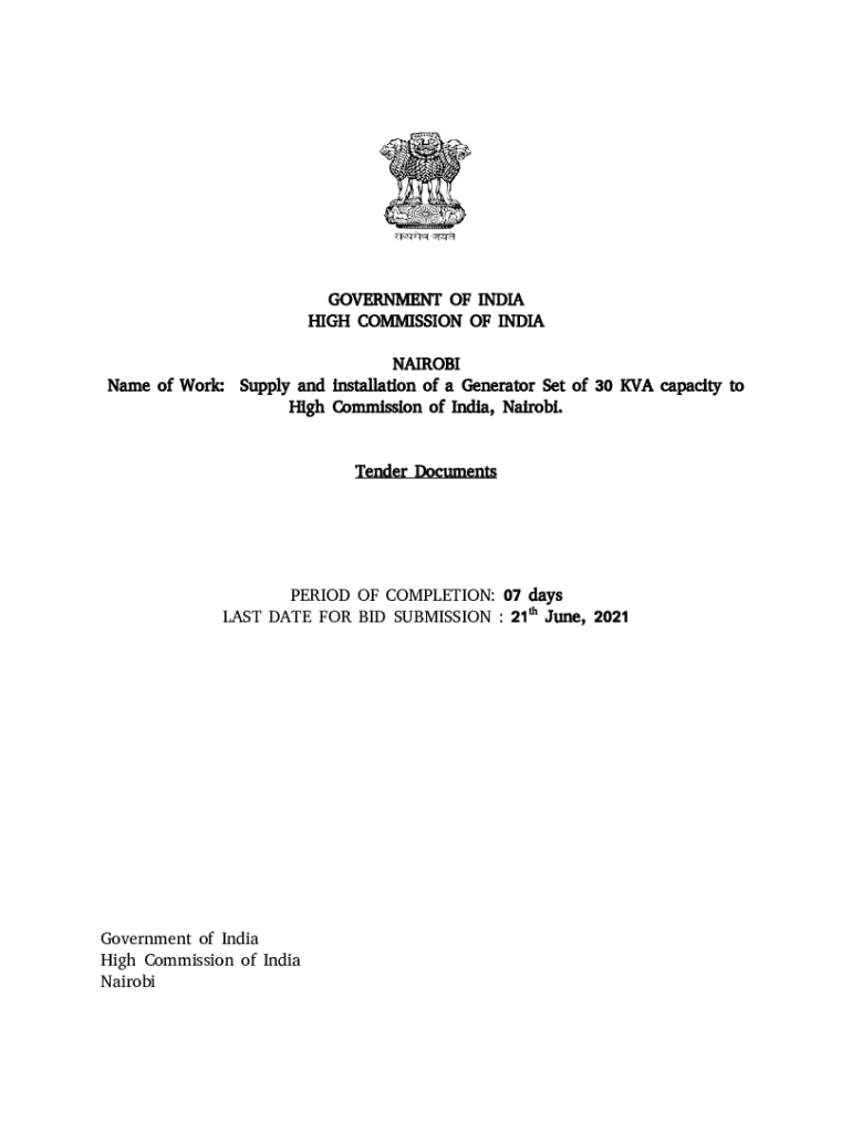 GOVERNMENT OF INDIA HIGH COMMISSION OF INDIA NAIROBI Name of Work: Supply and installation of a Generator Set of 30 KVA capacity to High Commission of India, Nairobi.Tender DocumentsPERIOD OF COMPLETION: