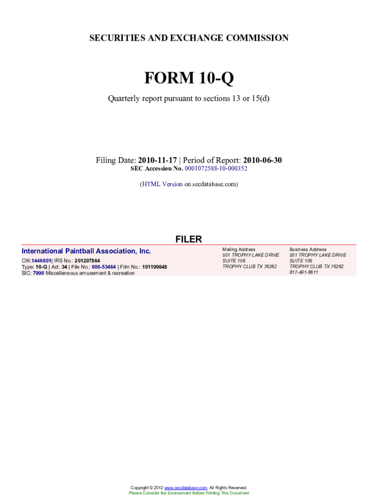 Este es un informe trimestral presentado por International Paintball Association, Inc. de acuerdo con las secciones 13 o 15(d) de la Ley de Valores de 1934, que detalla la situación financiera de la compañía a partir del 30 de junio de 2010.