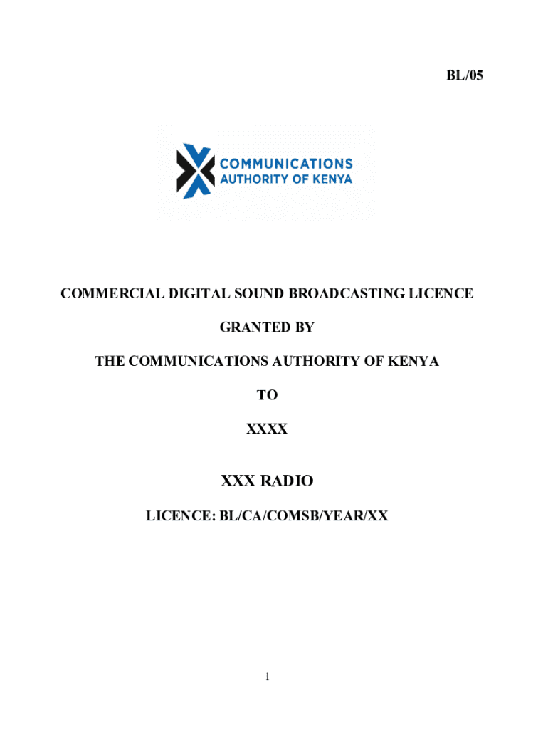 This Licence is issued by the Communications Authority of Kenya to authorized entities for the establishment and provision of commercial sound broadcasting services, detailing the terms and conditions that govern such operations in accordance with relevant laws and regulations.