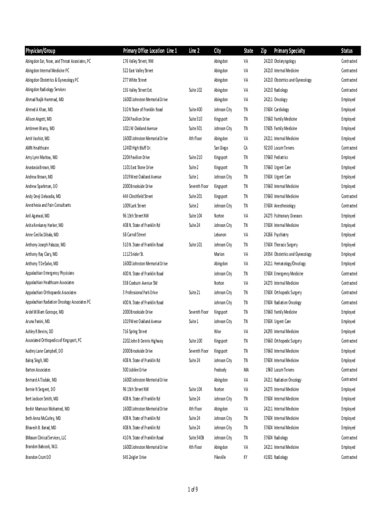Physician/GroupPrimary Office Location Line 1CityStateAbingdon Ear, Nose, and Throat Associates, PC176 Valley Street, NWLine 2AbingdonVA24210 OtolaryngologyContractedAbingdon Internal Medicine PC322