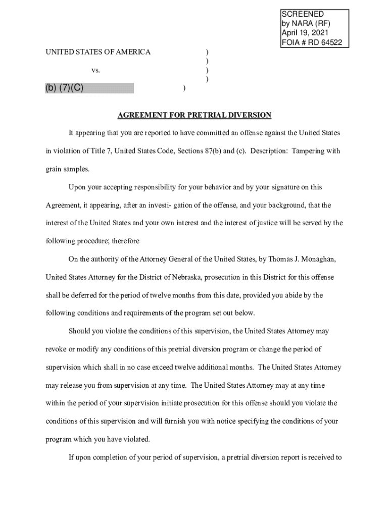 This document outlines the conditions and requirements for a pretrial diversion program for individuals charged with tampering with grain samples under Title 7, United States Code, Sections 87(b) and (c). It specifies the deferral of prosecution for twelve months contingent on compliance with specified conditions.