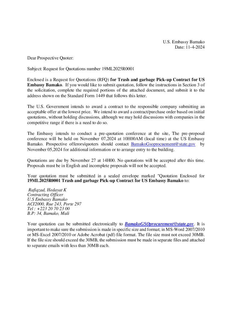 U.S. Embassy Bamako Date: 1142024 Dear Prospective Quoter: Subject: Request for Quotations number 19ML2025R0001 Enclosed is a Request for Quotations (RFQ) for Trash and garbage Pickup Contract for