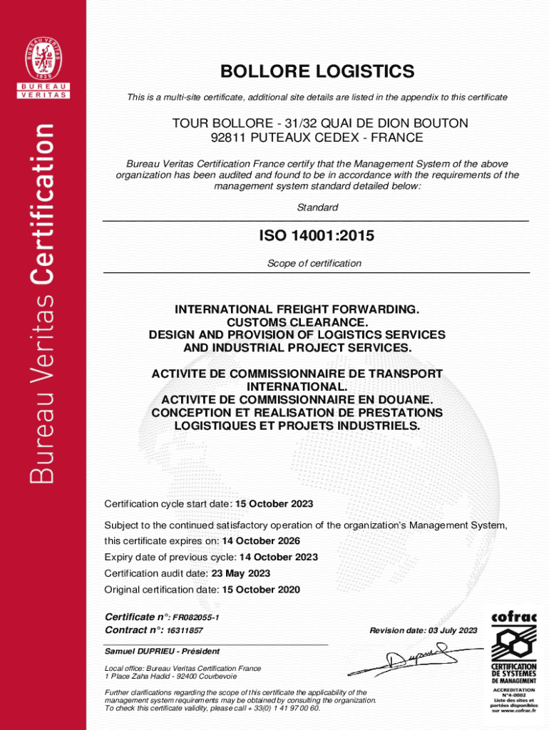 Ce document certifie que le système de gestion de BOLLORE LOGISTICS est conforme aux exigences de la norme ISO 14001:2015 pour l\'expédition internationale, le dédouanement et la fourniture de services logistiques.