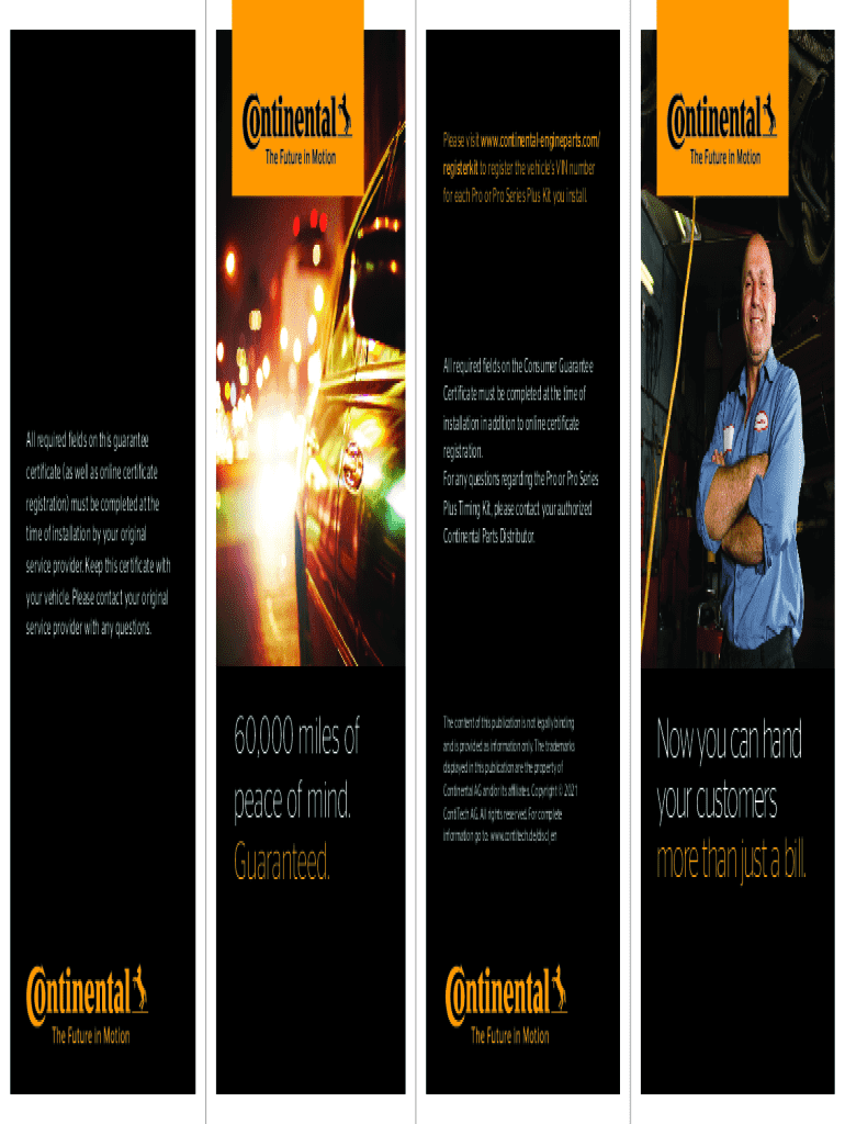 Please visit www.continentalengineparts.com/ registerkit to register the vehicles VIN number for each Pro or Pro Series Plus Kit you install.All required fields on the Consumer Guarantee Certificate