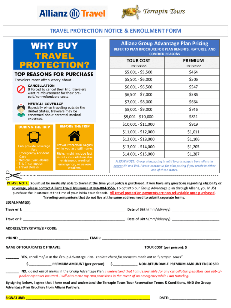 TRAVEL PROTECTION NOTICE & ENROLLMENT FORM Allianz Group Advantage Plan PricingREFER TO PLAN BROCHURE FOR PLAN BENEFITS, FEATURES, AND COVERED REASONSTOUR COSTPREMIUM$5,001 $5,500$464$5,501 $6,000$506$6,001