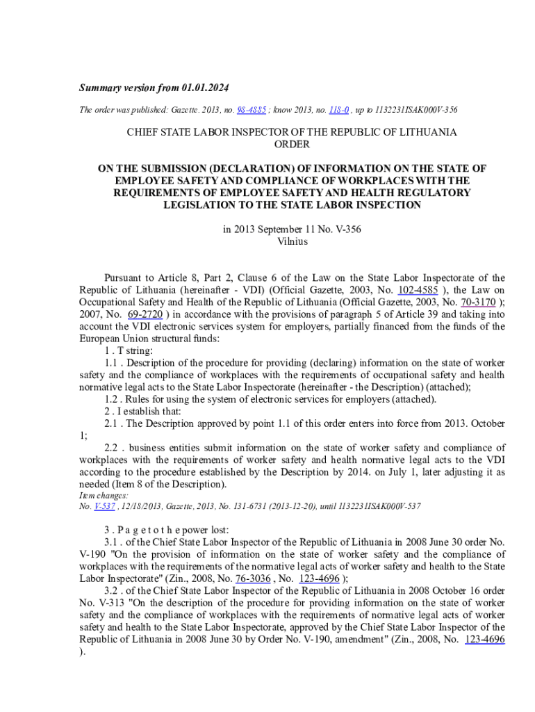 Summary version from 01.01.2024 The order was published: Gazette. 2013, no. 984885 ; know 2013, no. 1180 , up to 1132231ISAK000V356CHIEF STATE LABOR INSPECTOR OF THE REPUBLIC OF LITHUANIA ORDER ON