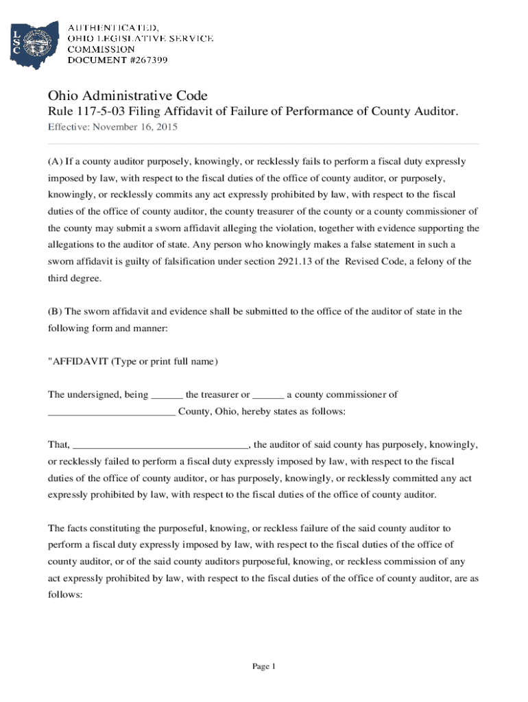 Ohio Administrative Code Rule 117503 Filing Affidavit of Failure of Performance of County Auditor. Effective: November 16, 2015(A) If a county auditor purposely, knowingly, or recklessly fails to