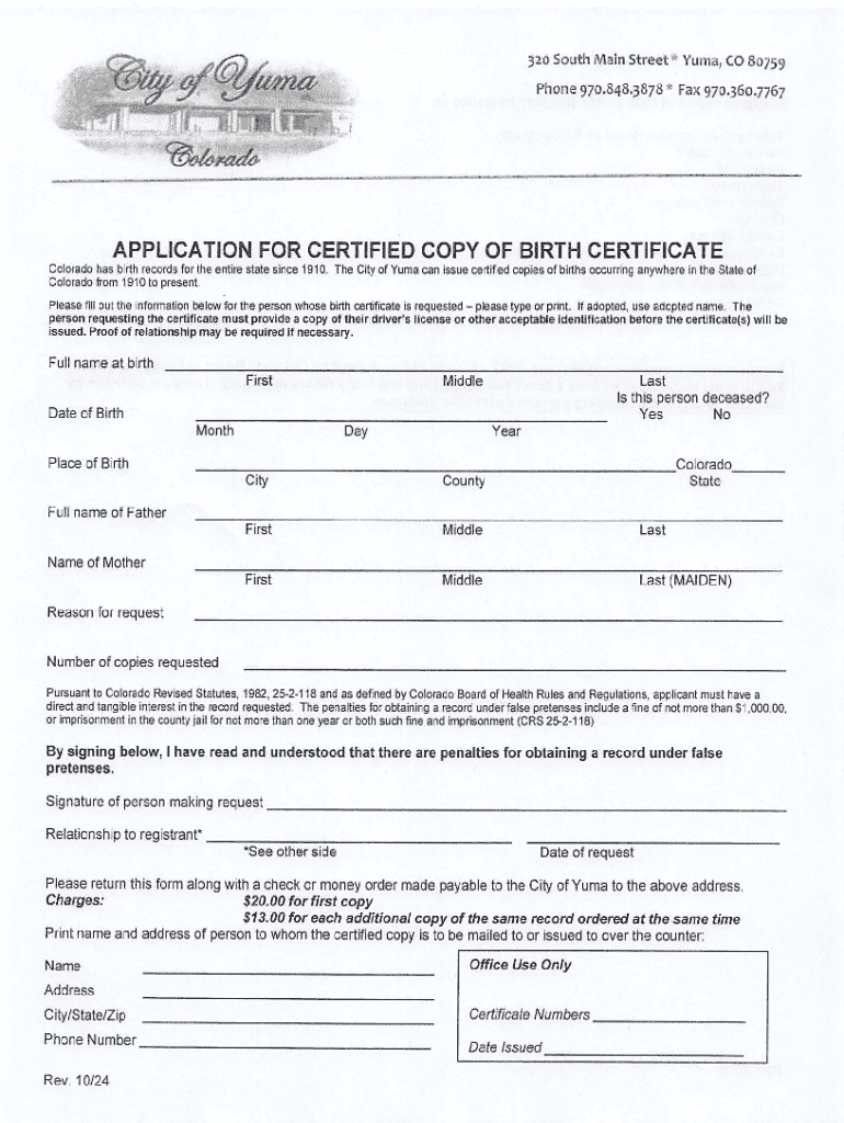 320 South Main Street * Yuma, CO 80759 Phone 970.848.3878 * Fax 970.360.7767APPLICATION FOR CERTIFIED COPY OF BIRTH CERTIFICATE Colorado has birth records for the entire state since 1910. The City