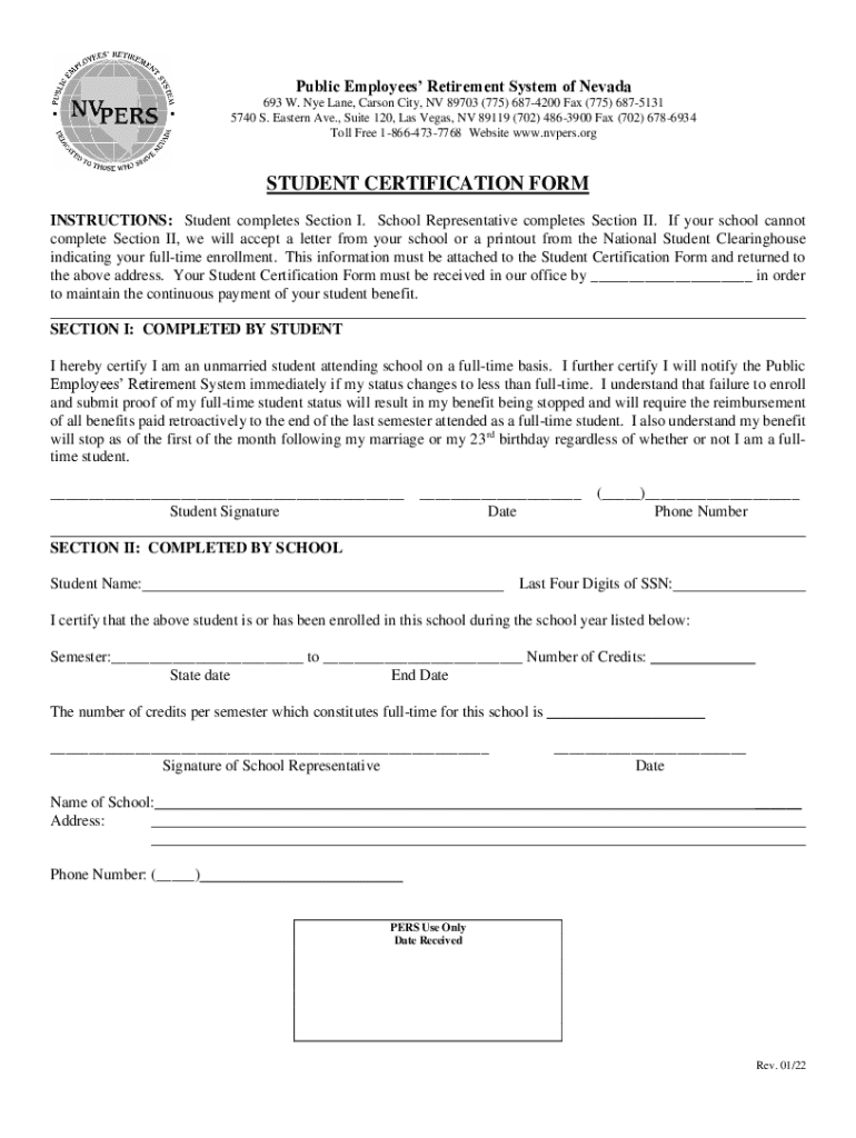 This form is used by students to certify their full-time enrollment status to the Public Employees’ Retirement System of Nevada in order to maintain their student benefits. Students must complete Section I and a representative from their school must complete Section II.