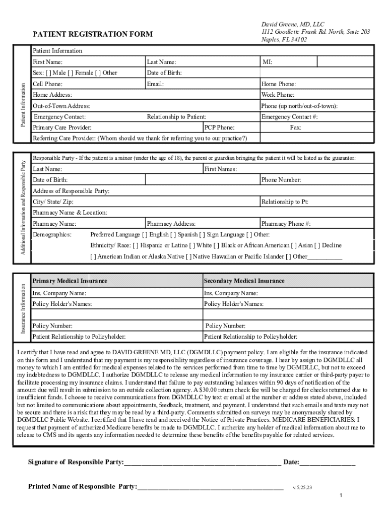 Este formulario permite la recopilación de información del paciente, incluidos los datos personales, historial médico y detalles del seguro. Es esencial para registrar al paciente en la práctica médica de David Greene, MD, LLC.