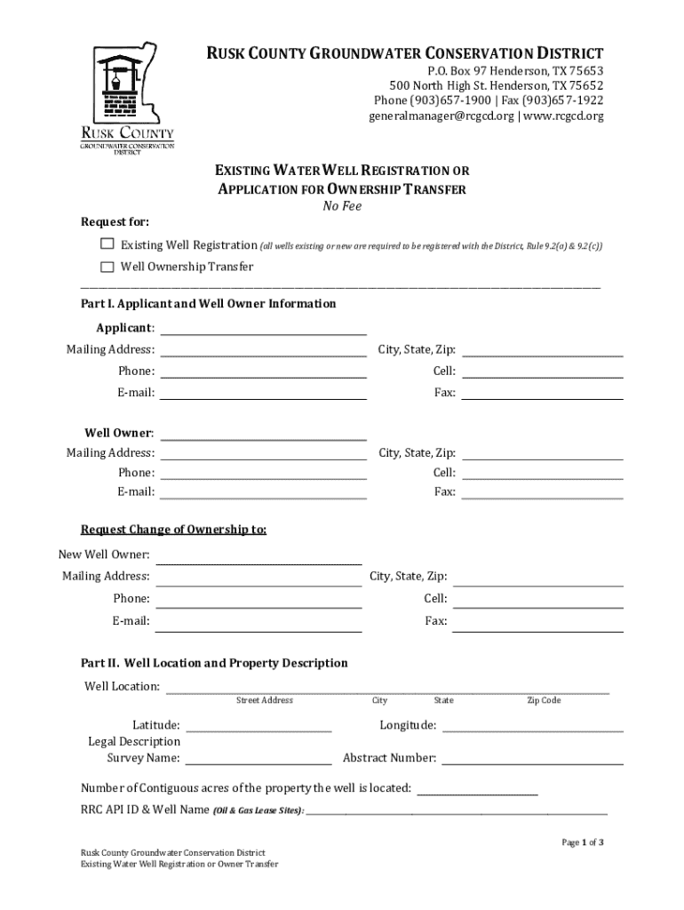 This document is used for the registration of existing water wells or for the transfer of ownership of water wells within the Rusk County Groundwater Conservation District. It collects applicant and well owner information, well location and property descriptions, well completion details, and requires a certification of the provided information.