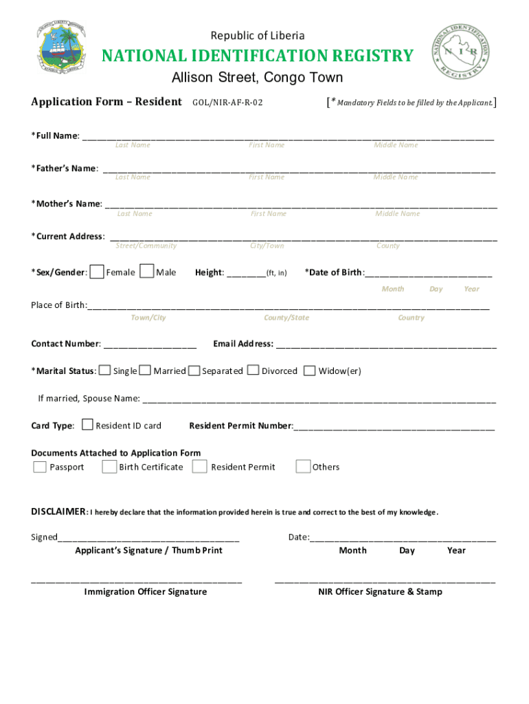 This application form is for residents of Liberia seeking to obtain a National Identification card. It requires personal information, including name, family information, address, date of birth, and other relevant details.